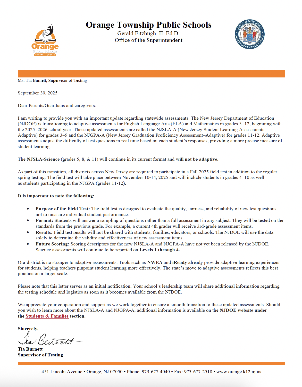 Please see the attached letter for important information about the upcomingNJSLA/NJGPA Adaptive Field Test.